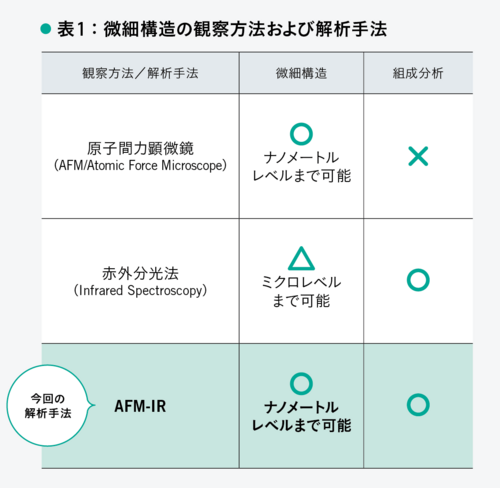 数種類の原料を混ぜて作られる高分子材料は、構造が複雑化・微細化しているため、より詳しい構造観察のニーズが高まっています。材料の構造を観察するには、大きく二つの方法があります。一つは、原子間力顕微鏡などを使って、高解像度で微細な構造を見る方法。もう一つは「赤外分光法」という、物質の組成を分析する方法です。しかし、それぞれ向き不向きがあります(表1参照)。