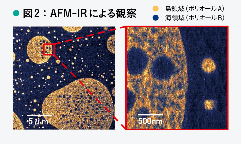 しかし、AFM-IRを使うと、海島構造※を形成していることが可視化できるようになり、測定波数からポリオールAが島領域、ポリオールBが海領域に存在することが明らかになりました。さらに拡大すると、島領域の中に海領域の成分が入り込み、逆に海領域の中にも島領域の成分が細かく混ざり合っている様子が観察されました(図2)。