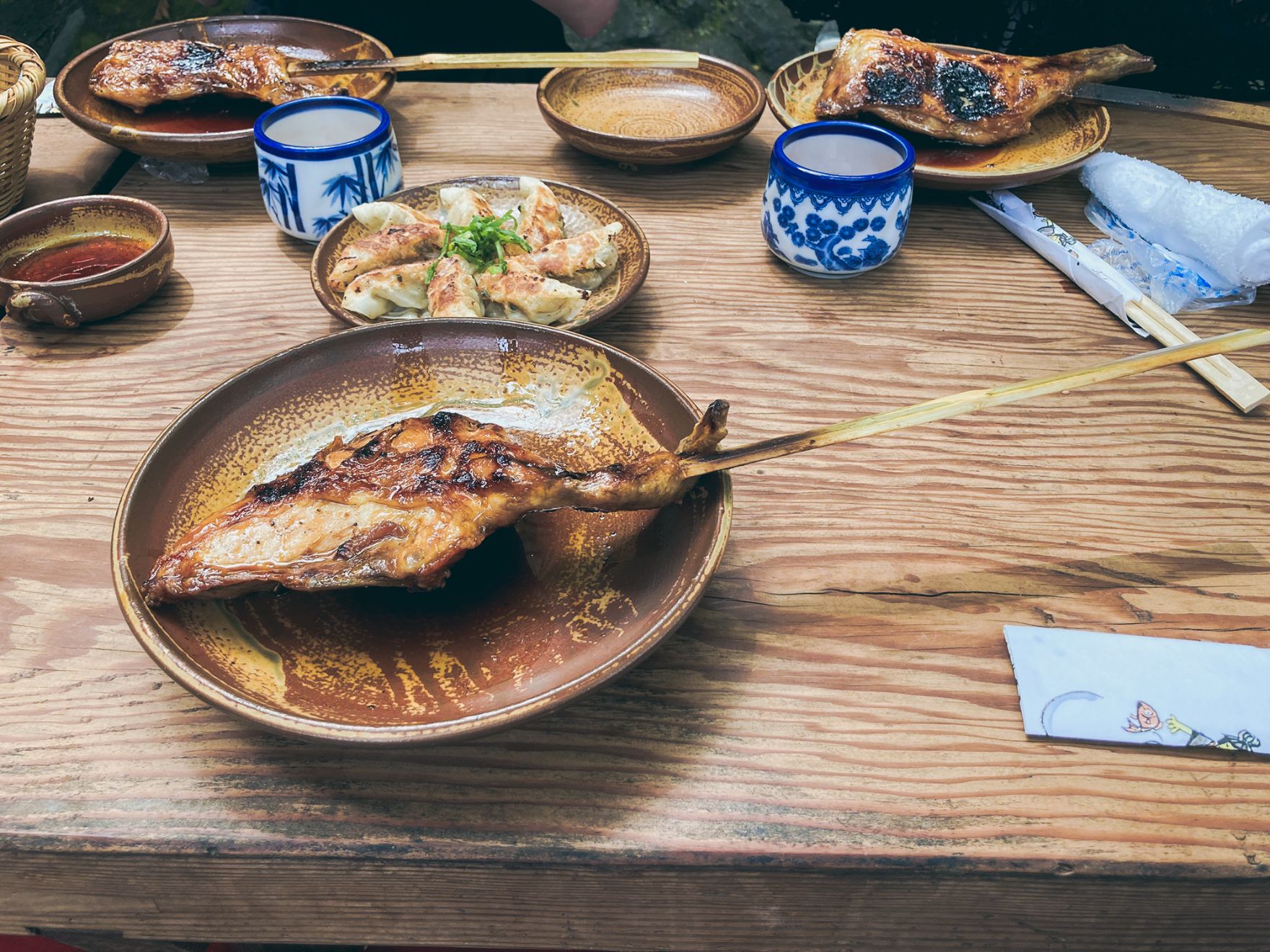 鶏肉を串に刺した山賊焼きという地元グルメが有名です。自然の中で豪快に串刺し肉を食べれば、気分はもう山賊です(笑)。